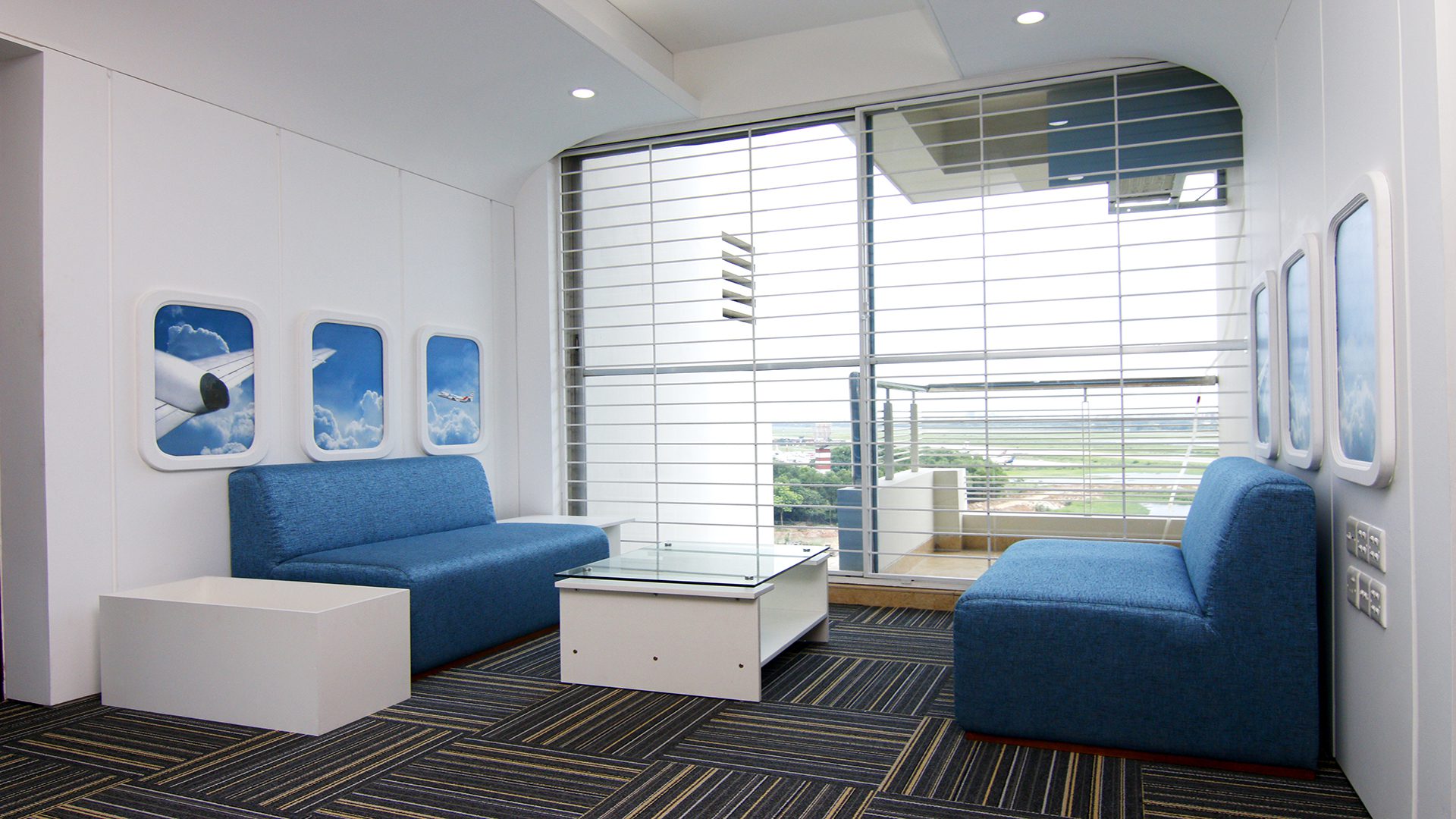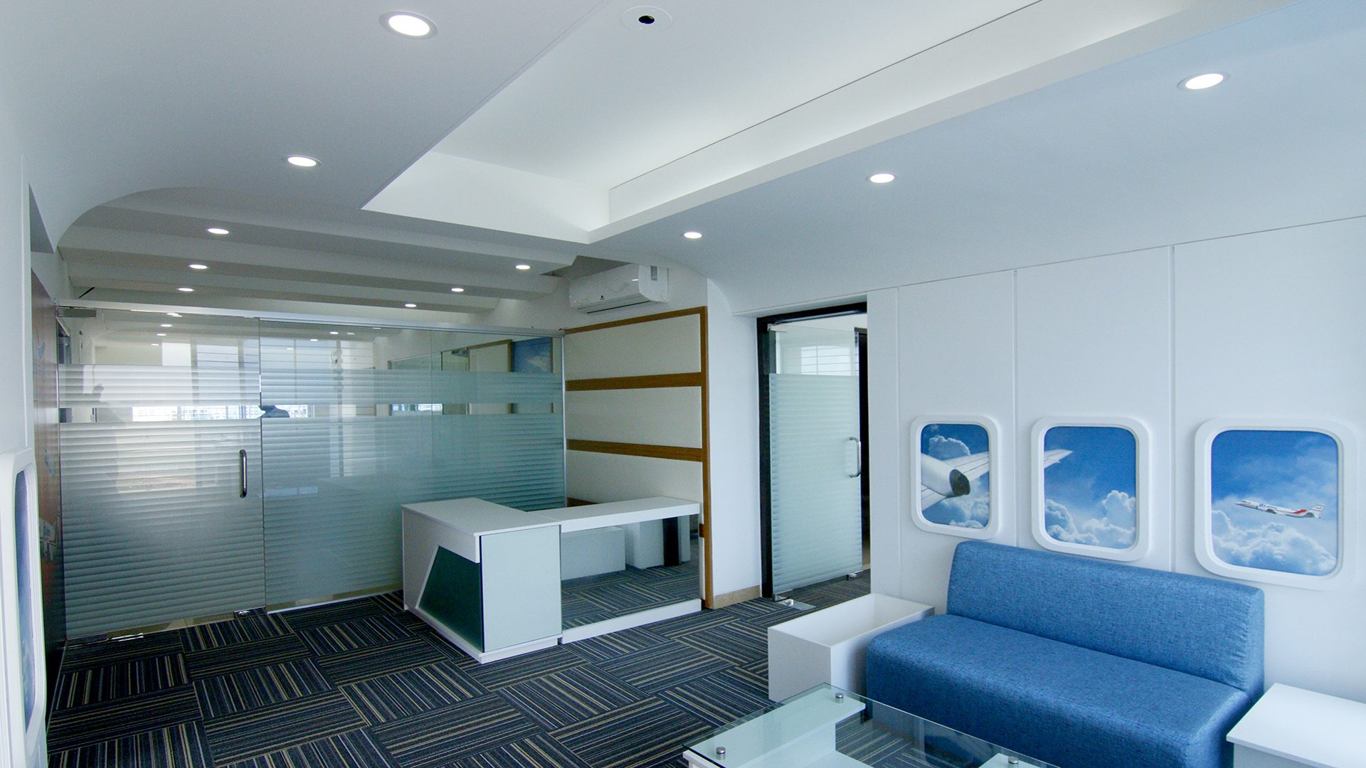 Runway Vibes: To enhance the aviation feel, the floor boasts a dark ash-colored carpet, reminiscent of runways. A strategic corporate blue color patch adds a touch of professionalism and aligns with the airline’s office brand identity. The carpet extends a welcoming runway, guiding individuals through the space with a sense of purpose.